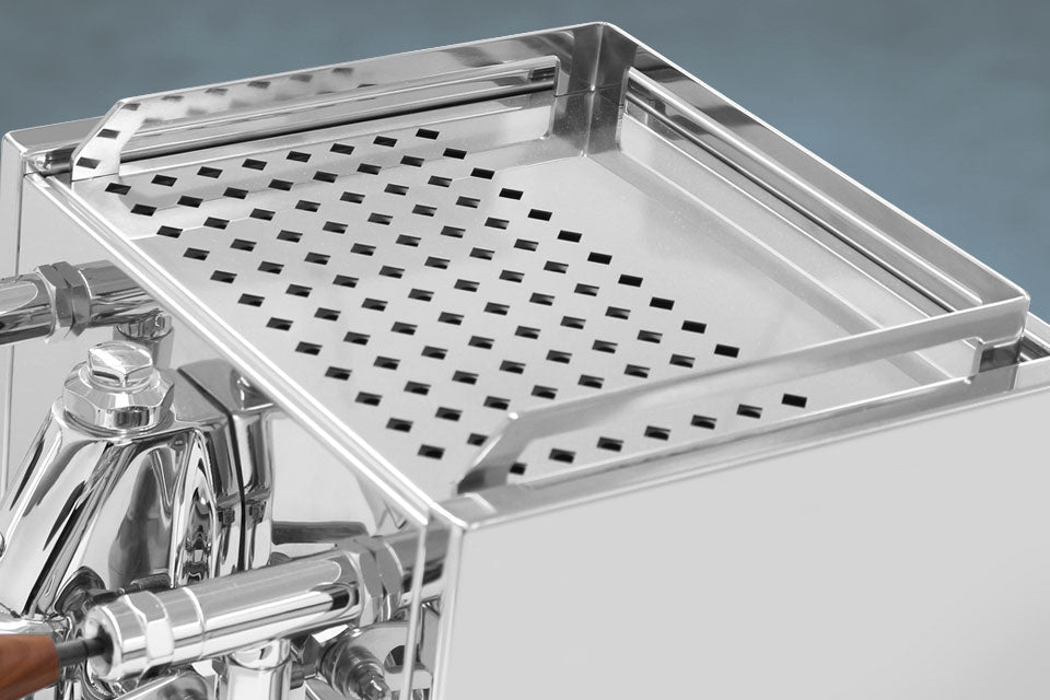 Σκελετός από ανοξείδωτο ατσάλι, γυαλισμένα πόδια αλουμινίου, μεγάλος θερμαντήρας φλιτζανιών και πρακτικός δίσκος συλλογής υγρών.