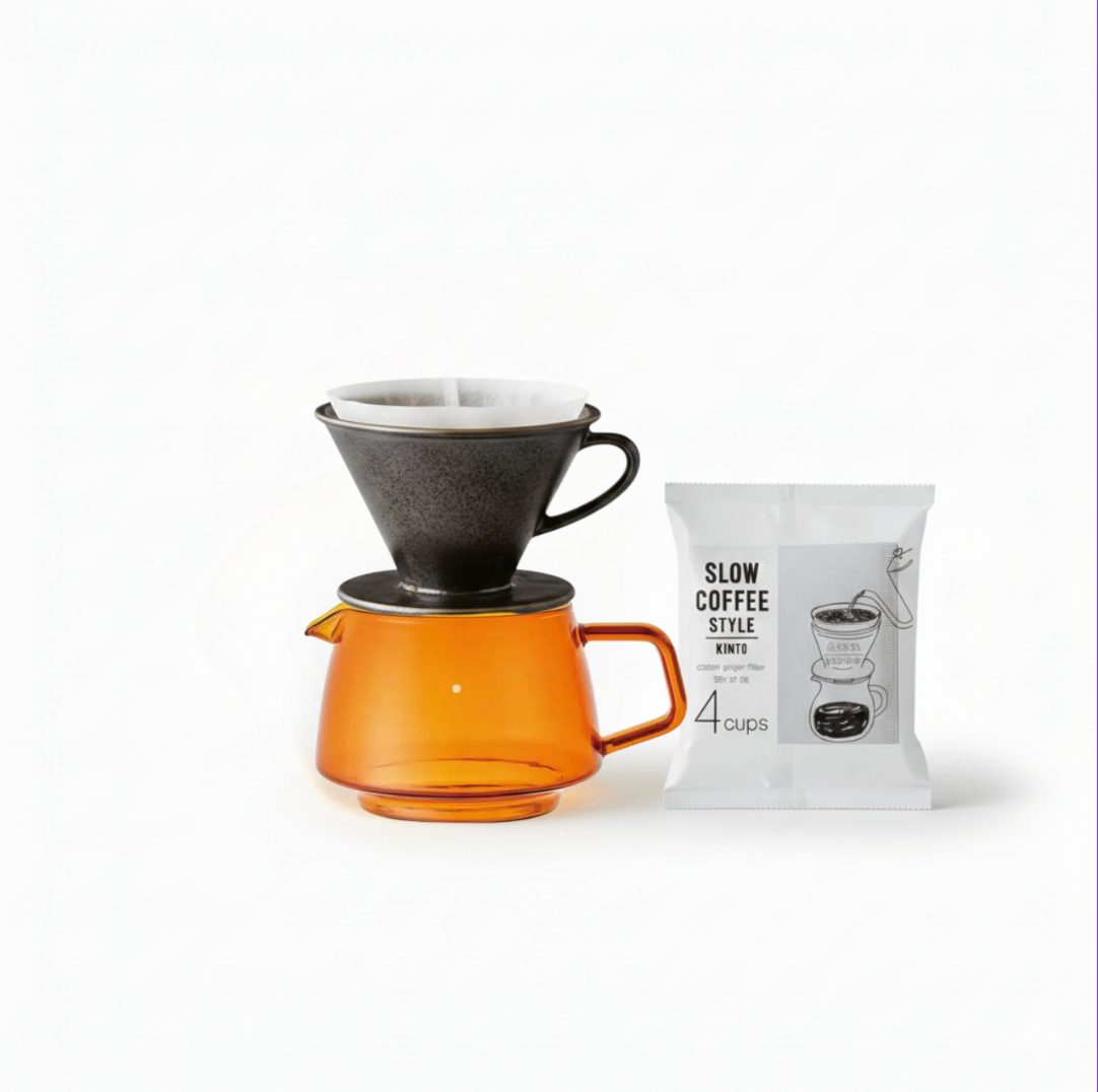 Σετ παρασκευής Kinto Slow style για τέσσερα φλιτζάνια. Το πακέτο περιλαμβάνει μια γυάλινη κανάτα Kinto Sepia 600 ml, ένα κεραμικό φίλτρο slow style scs-s01 κατάλληλο για 4 φλιτζάνια καθώς και 60 φίλτρα. Ιδανικό για όσους θέλουν να βρουν ένα λιτό σετ pour over έτοιμο για χρήση!